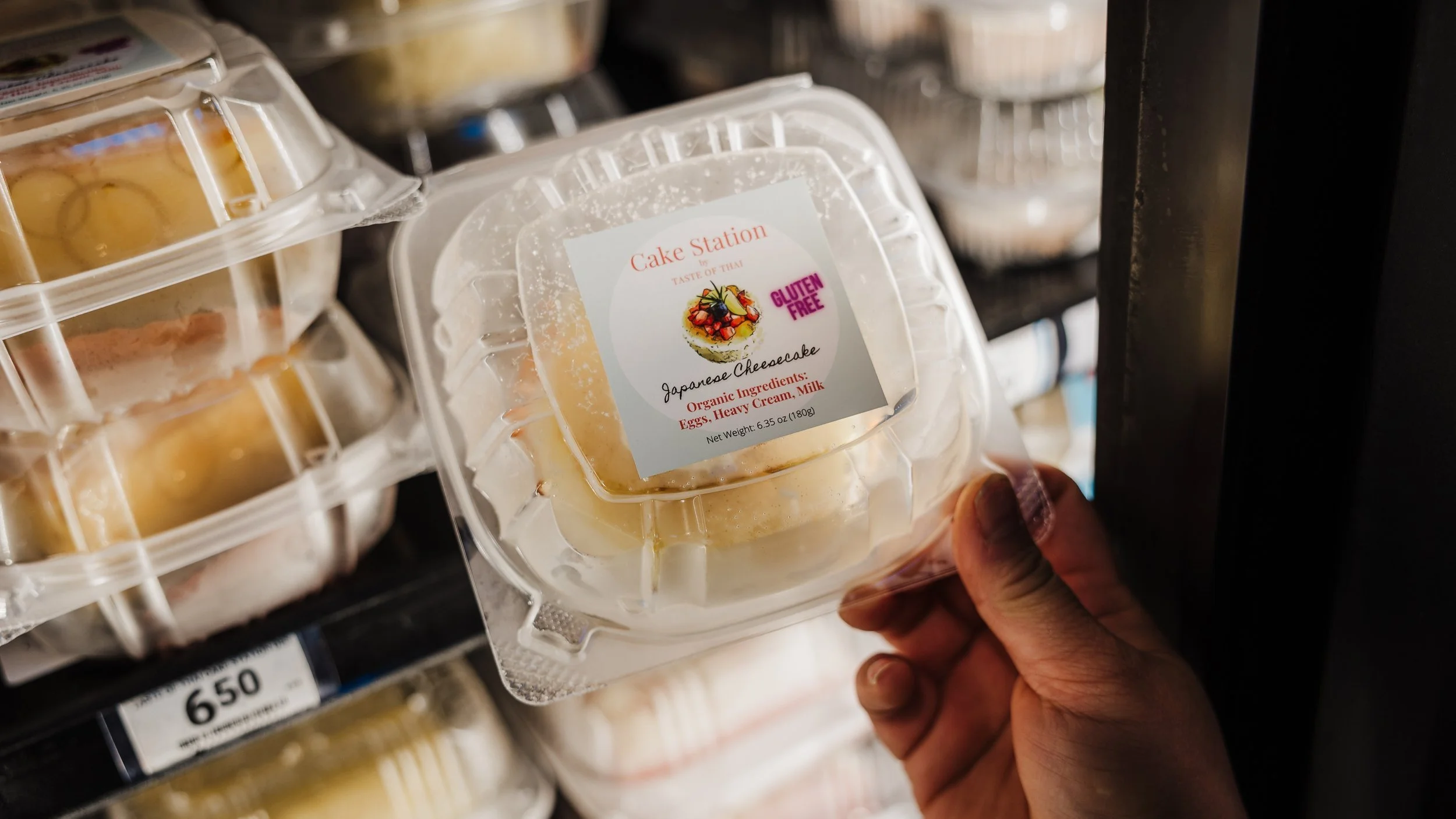 Yao proudly explains that Taste of Thai’s items take up an entire refrigerator shelf and that she returns to the Market twice a week to restock the shelves. She closely monitors inventory and adjusts her deliveries according to what has sold fastest. She adds that the restaurant’s cakes and pastries, made fresh in the restaurant, are also available.